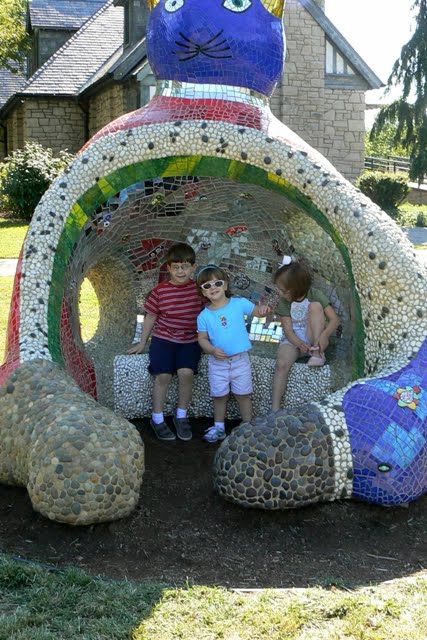 Yep.  There sat Ricardo with a BENCH inside. . . right beside a sign that instructed everyone to NOT climb on the sculptures.  What in the world? Fat chance.  I am pretty sure that artist Niki de Saint Phalle fully intended that cat for climbing.  We took our picture, admired the stones, let out a rebel yell and headed on into the park.