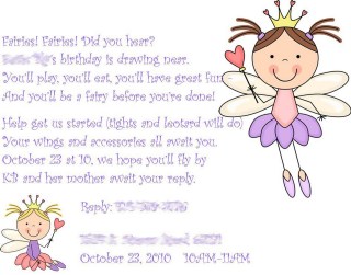 I gave KB a choice.  Turning three means a party with three friends at our house and I asked her if she would like a princess party or a fairy party.  She chose fairies.  I asked who she would like to invite and it sounded something like this, “I’ll invite Mowiah, Lizzy, Gwacie, Johnny, Ella, Sissy, Bubba, Daddy can come, ” and then she listed EVERY child from Toddler Time.  Mommy stuck to three guests and sent out invites: