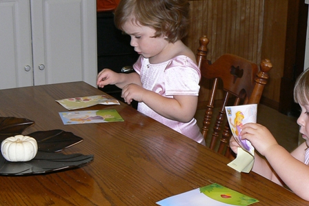 Then everyone came into the living room and chose an envelope.  Background info for those who have not seen the Tinkerbell movie: the fairies each have talents.  Tinkerbell doesn’t like her talent and tries to do everyone else’s job but is never successful until she is satisfied with her own talent and uses it for the benefit of the whole.  Well, our fairies picked envelopes that contained character traits.  The colors on their card let them know which tutu and wings would be theirs.