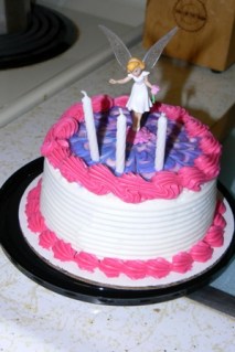 Honey picked out this cake.  All plans for the “mommy made” cake went out the door the day before when I started feeling off.  He did such a perfect job (pink and purple are KB’s favorite colors) and the fairy on the top fulfilled all promises of a fairy cake.