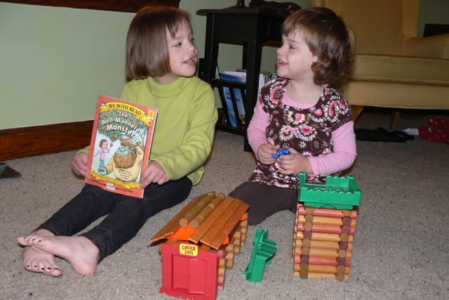 The Lincoln Logs have become a favorite.  It seems every day we build a “tower of twos” and another house of sorts.  On this day, Little read “The Well Mannered Monster” to KB after the build and before the demolition.  Sweet time with siblings.