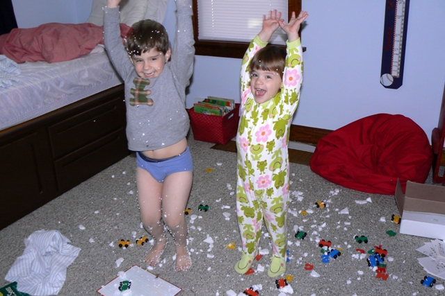 I can’t believe it has taken me this long to write about this little incident. Bubba was given this alphabet train last Christmas and I pulled it out of the closet in the first week of November. He played with it for two days straight. On a Thursday morning, when KB and Bubba were both home with me, I heard silence from Bub’s room and then laughing and jumping and carrying on. After it went on for awhile I went to check on what was so fun and found the room and the children covered in Styrofoam balls. The blocks of Styrofoam used to pack the train pieces safely in their box were now shredded and sticking to everything and everyone. The kids thought it was wonderful and were talking about snow and being cold (Bubba is really dressed for snowy weather), etc.