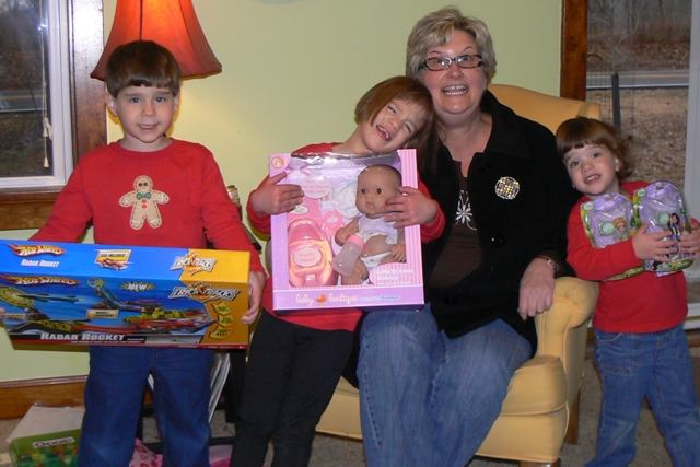 Sweet Linda took all three kids shopping this weekend for Angel Tree gifts. Each child picked an angel off the tree and each kid chose someone of the same gender and age as themselves. After lunch at McDonald’s they all trooped over to Walmart and made their selections. Next they came home and we wrapped everything up.