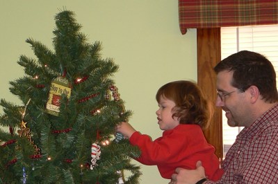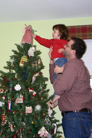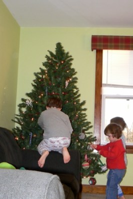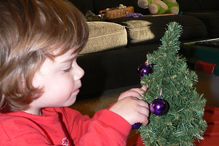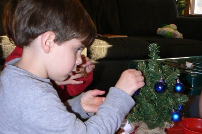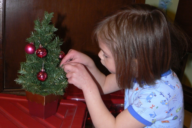 The kids had their own little trees to decorate for their bedrooms.  I used it as a warm up to putting ornaments on the big tree; it helped them master the fine motor skill of manipulating those hooks over limbs.  (Don’t I sound all purposeful.  Don’t be fooled.)