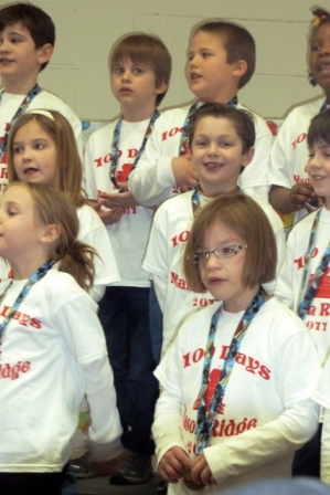 Next they counted to 100 by 5s and then they counted to 100 by 10s.  The Principal told the children “good job” in 100 different ways and the kids quoted a poem with 100 words in it.  And then there was singing, which Little also pulled off very well.