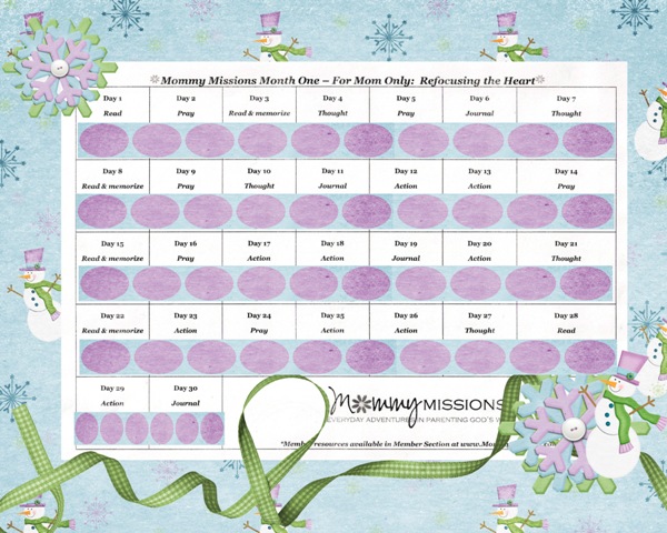 At the end of 2010 Mommy Missions had an incredible sale and they offered a year subscription for less than half of their normal price.  Shot through with a big dose of humility I signed up.  I’ve only received the first month’s plan and it wasn’t for the kids. . . it was “For Mom Only: Refocusing the Heart”.  It’s very simple – no rocket science but I have to say. . . it’s been over a week and I have memorized two verses and spent time each day in prayer for my heart and my kids.