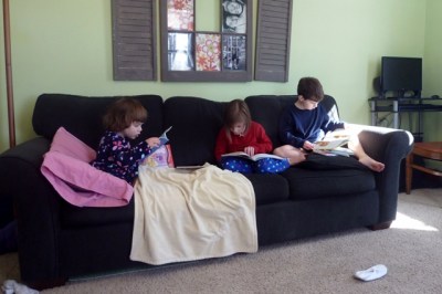On one of the snow days last week I remembered all this. I had just a few chapters left in the book I was reading and saw an opportunity . . . for me AND my kids, mind you. So, I called everyone to the living room and announced, “Kids, it is 3:45 and time for D.E.A.R.” I handed Bubba his Magic Treehouse book, gave Little her “book box” selection, Stinky Socks, and handed KB 3 picture books to peruse. We had 15 minutes of reading time.
