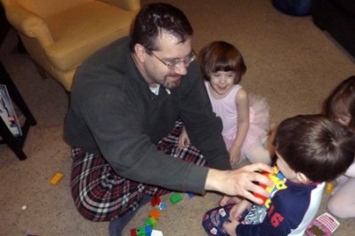 This next picture shows and adorable KB laughing with her daddy and you can tell Bubba is starting to get excited. The real purpose of the photo is to show you Little’s rooster-do. Every morning for 7 years, except for the bald months, Little has woken up with this hairdo. It’s awesome.
