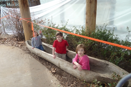 The hippos are a favorite since they are in a pool and you can watch them swim like fish at an aquarium. This visit was a disappointment in regard to the hippos. Everything was roped off and the plastic covering the windows was sagging just enough that we could see two of the glass panes had shattered. Yikes. We asked and apparently they broke during one of our recent freezes. Nice. The kids didn’t seem to mind. They noticed this canoe for the first time and decided to go traveling.