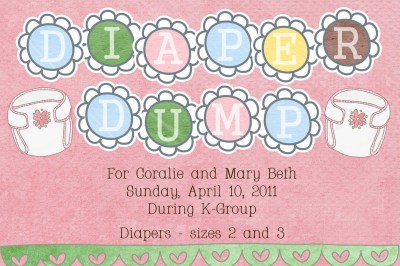 This past Sunday our small group had a little thingy for two new moms in the group.  It wasn’t big enough to call a shower and Coralie’s friends had already used the term “sprinkle”, sooo we went with Diaper Dump.