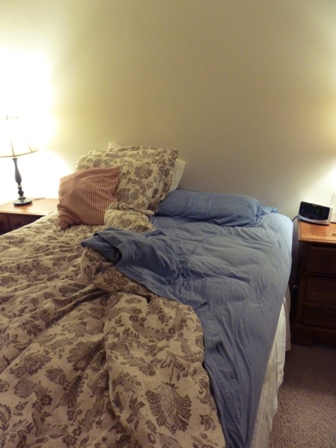 Honey has been out of town this week and I practiced and discovered just how one stands an unmade bed.