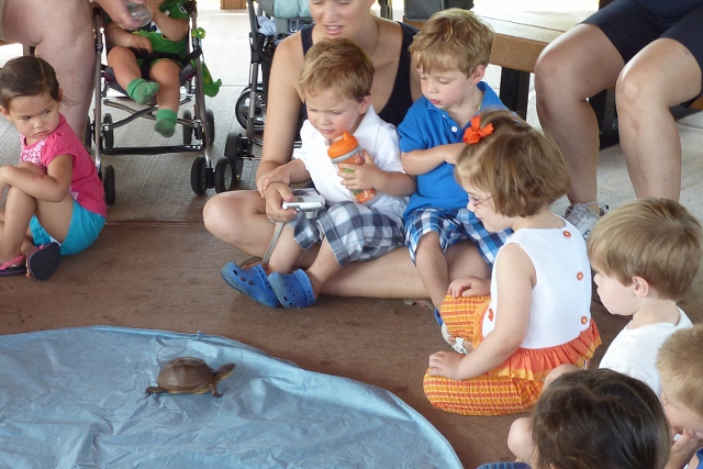 The highlight, of course, was when the real live turtle was brought out and allowed to run free between the toddlers.  The time ended with a craft (turtles made from paper plates and tongue depressors).   Good times.