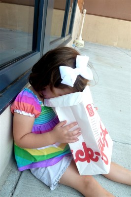 In true Blue Hutch fashion, we decided to do Chickfila for lunch.  We WERE already at the mall so it just made sense *grin*.  Halfway through the meal KB started looking peaked and super mom (that’s me) got a fry container under her chin JUST in time to keep her sickness contained.  You should have seen the men moving.  Almost immediately I had Chickfila bags-o-plenty.