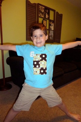 One of my best friends has politely pointed out that Bubba’s birthday is glaringly absent from this blog. I forgot. It’s very indicative of how his birthday went. I didn’t forget the day or the shirt, but I just wasn’t as aware as usual and the day just went by with minimal fanfare. My little boy turned six and it was just so-so. Still, I tell you about it, cause the shirt was cute and the cake needs the opportunity to end up on “Cake Wrecks”.