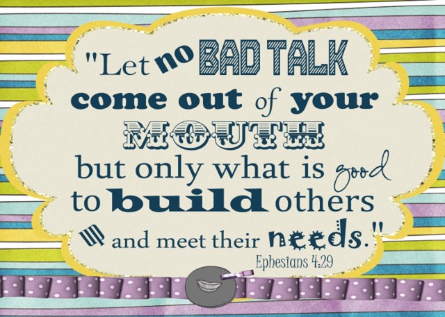 Imagine my surprise when, as a mommy, one of the first verses I wanted my children to learn was NOT “God is love” or John 3:16. . NOOOOO, I wanted them to learn Ephesians 4:29.  Turns out it’s a great verse for little kids to know.  It’s amazing what comes out of kids’ mouths.
