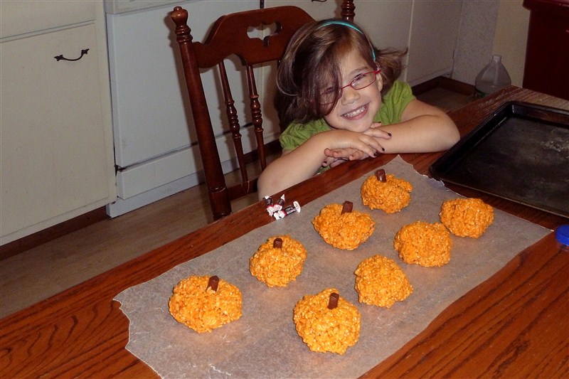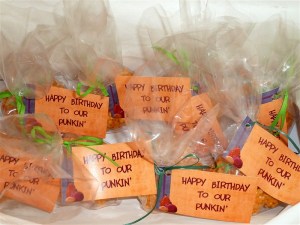 The first mini party took place in her preschool class.  We made Rice Krispy treat pumpkins (her birthday was at the end of October) so that allergies wouldn’t play a role in the day.  Just a side note: this was a GREAT snack to make together.  It was quick and simple and there were plenty of opportunities for a little one to help.  KB especially loved sticking the Tootsie Roll stems in!