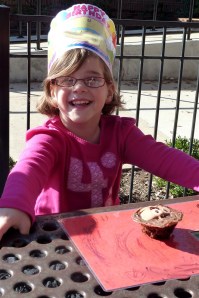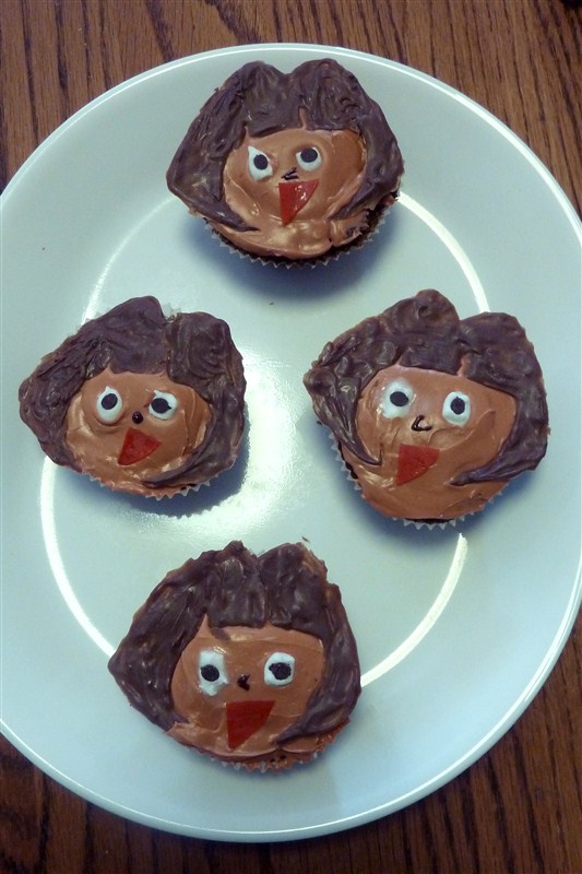 Oh yeah! Dora cupcakes, baby! KB loved them and that was what was really important.  Little piece of info: you CAN make cake mix cakes without egg!! Using Coke is the answer for an egg allergy folks.  Problem? The cupcakes were so very moist that they smushed around under the weight of the icing and it made the Doras look more and more scary.  Good Times.