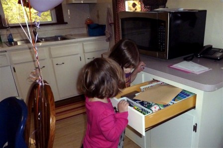 When all of the family were home for the evening, we got ready to have our family partay.  Honey kept the kids busy while I went out into the yard to set things up.  When everything was ready, we met in the kitchen and the fun began.  I asked KB if she would get the candles out of their place in the drawer.