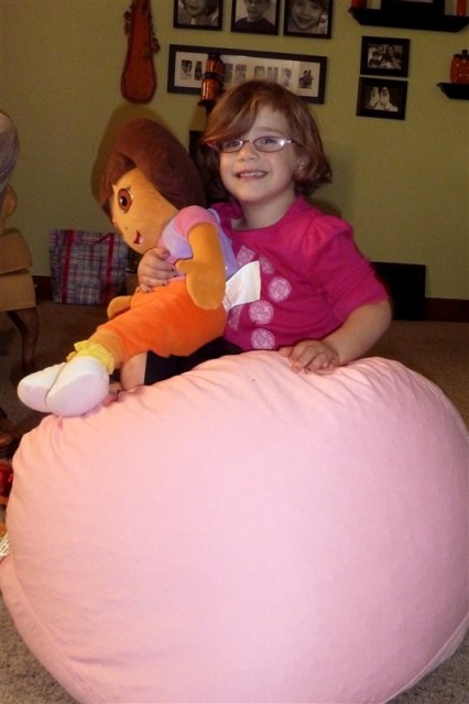 It was such fun.  We ran right inside and had cake and opened presents.  KB’s favorites? A Dora pillow doll, of course, and her new bean bag!