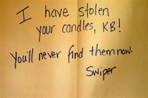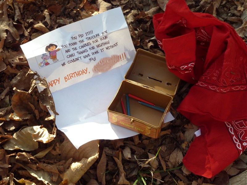 All that was left was to find the Treasure Garden.  On the map it looked like there were three trees in a triangle and so we looked around our yard and found a triangle of trees in the front yard. (imagine that!!!) When we arrived at the trees we found a treasure chest and Swiper’s red bandana.  He’d been there, alright, and must have dropped his bandana when he heard us coming! We looked in the treasure chest and . . . wait for iiiiit. . . there were the CANDLES!!!
