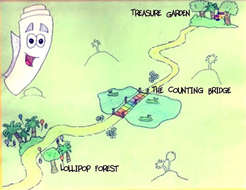 I gave them this map and we learned Swiper had taken the candles to Treasure Garden.  The way to get there was  through the Lollipop Forest and over the Counting Bridge.  “Forest, Bridge, Treasure Garden!   Say it with me!” Oh yea, we said it all together and then even sang, “Come on, vamanos! Everybody let’s go! Come on let’s get to it! I know that we can do it! Where are we going? (Treasure Garden!) Where are we going? (TREASURE GARDEN!)”