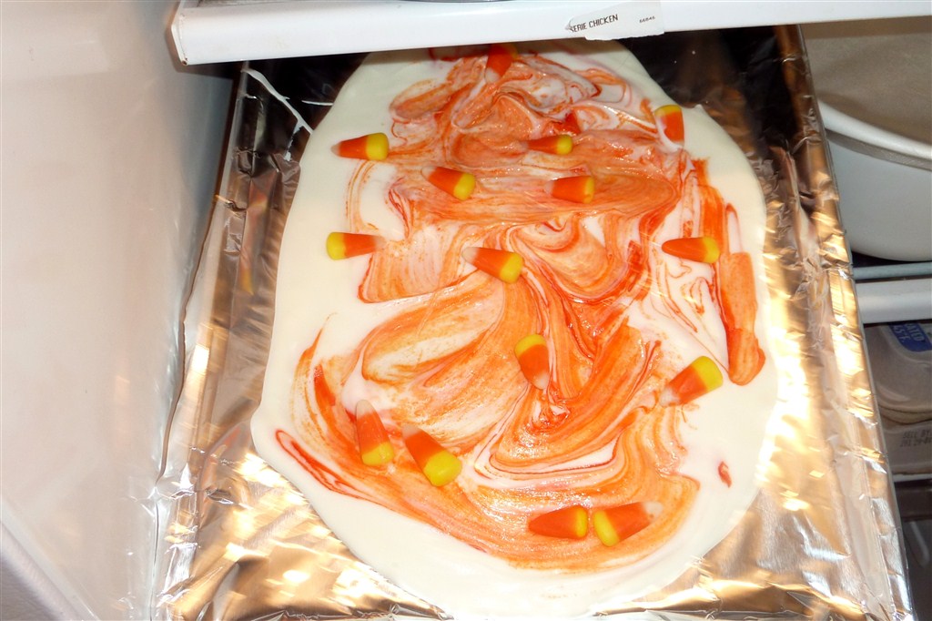On Halloween we were sitting in the living room when “Martha Speaks” went off and a cooking show came on. KB wanted to watch it (she is determined to be a baker when she grows up) and they showed us how to make candy corn bark. My sweet mom suggested we go make some right then (we being KB and I) and so we did. My little girl was a happy girl!