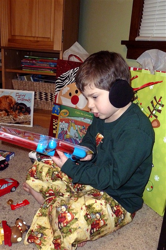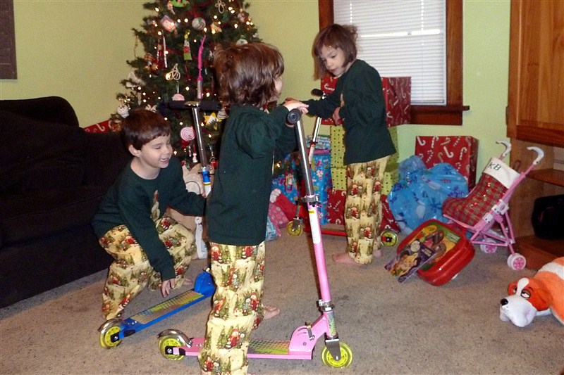 It was hard to have them miss the squealing and excitement over their generosity.  My mom didn’t get to see Little’s ecstatic response to the LeapPad they gave her and the complete tunnel vision that followed.  Jeriald and Linda didn’t get to see how KB tried to ride her scooter around the house from the minute she saw it – even from present to present before the floor started getting too crowded.  And I was sad that my brother didn’t get to see Bubba open the pop-up Star Wars book that he picked out for Brooke to give Bubs.  Anna would have loved to see KB with her pink guitar and the jam session that followed.