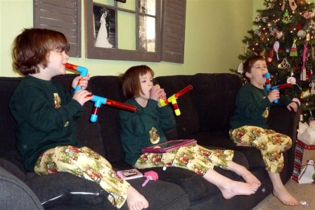 Our kids slept past 6:00AM for the first time in . . . years . . . and we even had to WAKE UP KB!!!! We all trooped upstairs and climbed up on the bed to read God’s Word.  Honey read from the ESV and then Bubba read from the Early Readers Bible.  (He even asked us the “were you listening” questions at the end.  When KB got an answer wrong, Bubba replied, “That’s almost right, KB.  Anybody want to try and help her?” HA!) After singing Hark the Herald Angels Sing and Joy to the World, we headed downstairs where I put breakfast in the oven and then WALKED OUT THE BACK DOOR AND AROUND THE HOUSE to get into the living room and ready for pictures.  (We cover the door with wrapping paper each year to keep children out of the living room until we are ready for them.)Each child had two or three “Santa” gifts to greet them as they burst into the room and they opened their stockings.  We then ate and got ready for church.