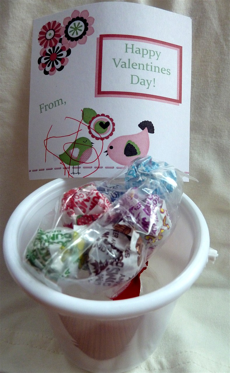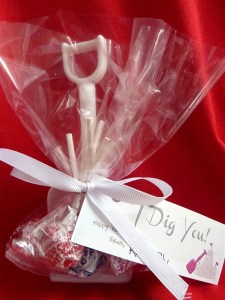 KB was the kiddo with two classes this year. She has a class of 8 in Mother’s Morning Out and then a class of 10 in preschool. I used a Pinterest idea (link on Pinterest page) and did what I do best: tweaked it. We had a gazillion DumDum Pops for some reason and so, instead of purchasing M&Ms for little bags to attach to shovels, we just used a bouquet of lollipops. The shovels went to one class, the pails went to the other.