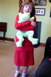Olivia loves red (a pig after my own heart) and wears striped tights and a little red dress, SO, I found some red and white striped leggings, whipped up a little skirt to go with the traditional birthday t-shirt and could have done nothing else for the rest of the day. Talk about bang for your buck! I spent less than $10 and my little girl talked of nothing else for days. “I am dressed like Olivia!” and “I dressed like Olivia”.