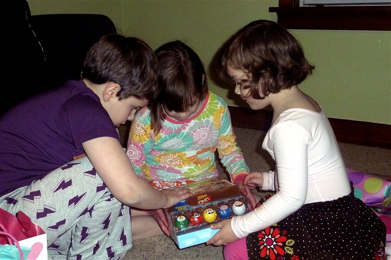 We had a simple family celebration at home – cake and a couple of gifts. Pet Pals 2 for the Leap Pad was the “giddy gift” in Little’s mind, but the siblings were most excited about Uno Moo.