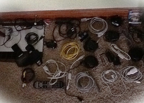 Can you believe all these cords were crammed into the bottom drawer with a portable cd player and screwdriver? Well, I’ve laid them out so all Honey needs to do is look and divide them into the black trash bag or small storage box.