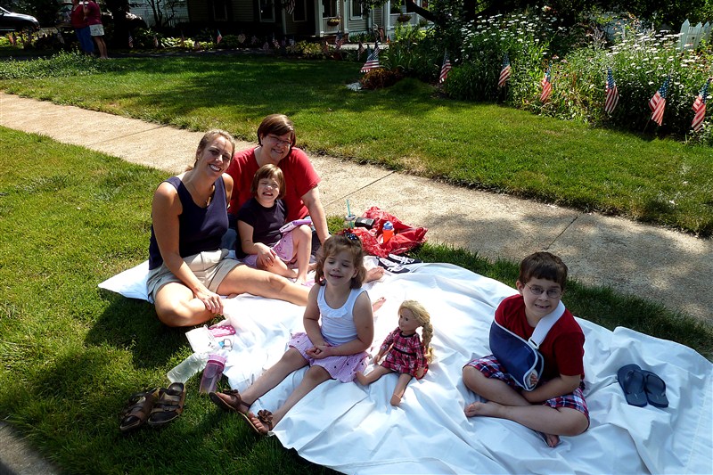 We spent July 4 with my friend Shelley for the third year (or is it fourth?).  What is shameful and delightful is that I haven’t seen Shelley since last July BUT I overheard the kiddos discussing the upcoming holiday and recounting how we always go to the parade with Ms. Shelley and see the horses and catch candy.  I love that they are old enough to recognize this as “tradition” and that they know Ms. Shelley and love her even when visits are far between.  (Shelley and I have since made a reoccurring monthly date so that last year will not be repeated.)