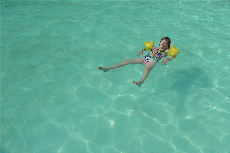 The kiddos had just finished swimming lessons and Little wanted to show her Daddy what she had learned: how to float “like a starfish”. Give that girl a pair of water wings and she is content to troll the pool for the duration. She did come alongside to let her daddy throw her too. She mastered blowing out when she was above the water, but the skill completely left her once the water hit her face. (We are signing up for more lessons this Fall.)