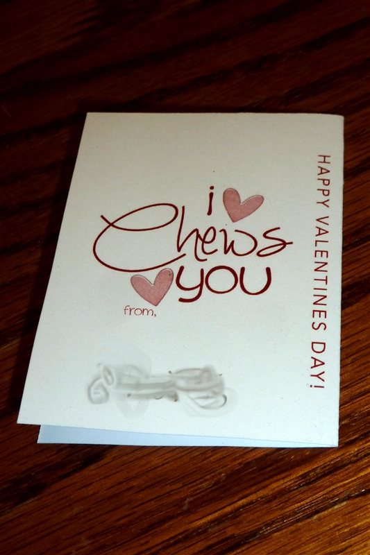Thankfully I didn’t read the article until AFTER we had done Valentines this year. . . they were so cute and the kids did a great job on them. Everyone gave bubble gum with notes that read, “i chews you” on the inside.