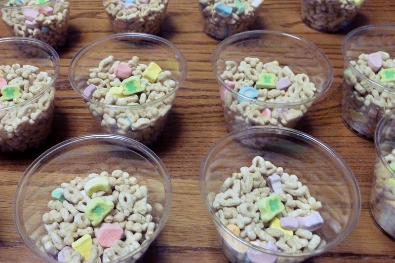 KB had snacks on a Monday in March. . . the Monday before St. Patrick’s Day.  I didn’t read the note from the teacher until Sunday night and so I had to bust a move to pull snack together.  In honor of our leprechaun buddy, “Lucky”, I pulled together little cups of cereal and took milk for the teacher to pour.  Small effort – Big impact.