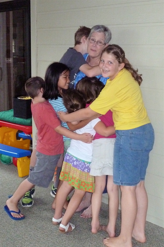 Many people would think that our family is just plain weird, but I happen to think we are super fun. On a rainy morning we split into two teams and created team cheers. Memom orchestrated an entire event – the Summer Games of 2013. You wouldn’t believe how much you can play on a screened in porch!! Here you see one team doing their cheer. . .