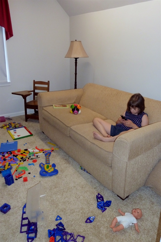 In the above picture you see what Little calls, “her play room.” This is an upstairs room at my mom and dad’s house and it’s where Little sleeps when we are there. There are a few toys, a tv with dvd (and video) player, and a couch that folds out into a bed. Throughout the entire trip Little would disappear and could be found in “her play room” doing a variety of things, but often with an iDevice in hand.