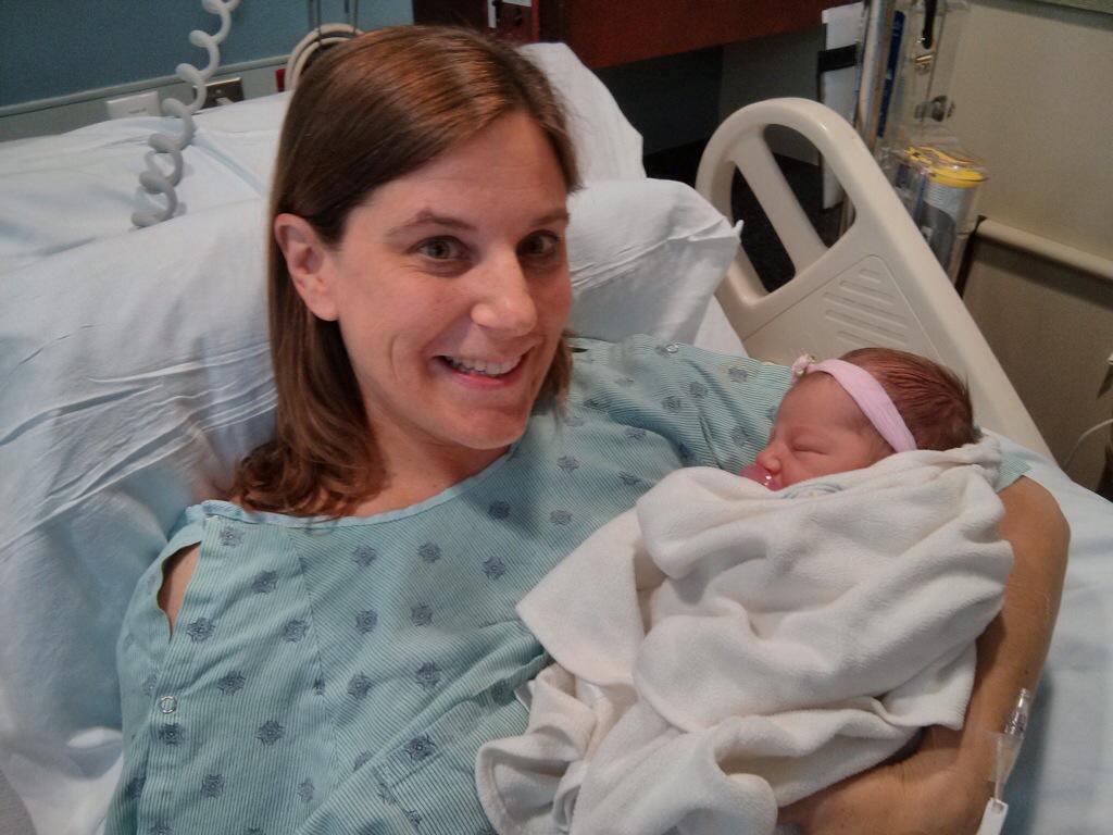 I scooped all the kids into the van after work and we headed to the local hospital to visit our friend who just gave birth to her fourth child and first daughter. Little has done nothing but talk about Mrs. Wacker’s baby for months and I think Caroline was as excited to see Little with her newborn as I was to hold the newborn. As my “luck” would have it, the phone didn’t actually take the photo of Little holding Baby Jane. It was adorable. Take my word for it. It did capture my sweet friend Caroline (who looks 23 in this photo, for Pete’s sake!)