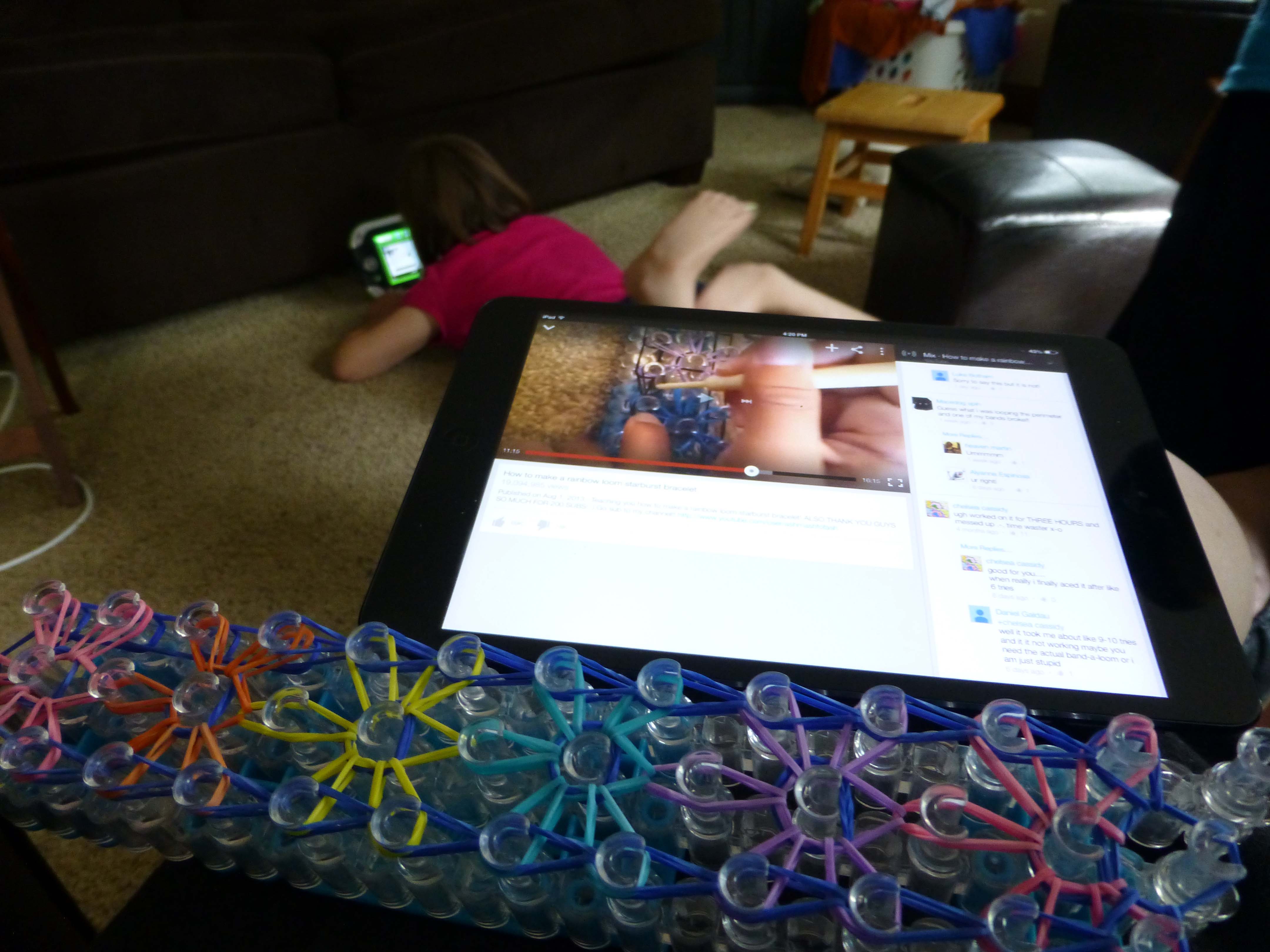 This is what it looks like to “help” Little make a “Rainbow Loom Star Burst Bracelet”.