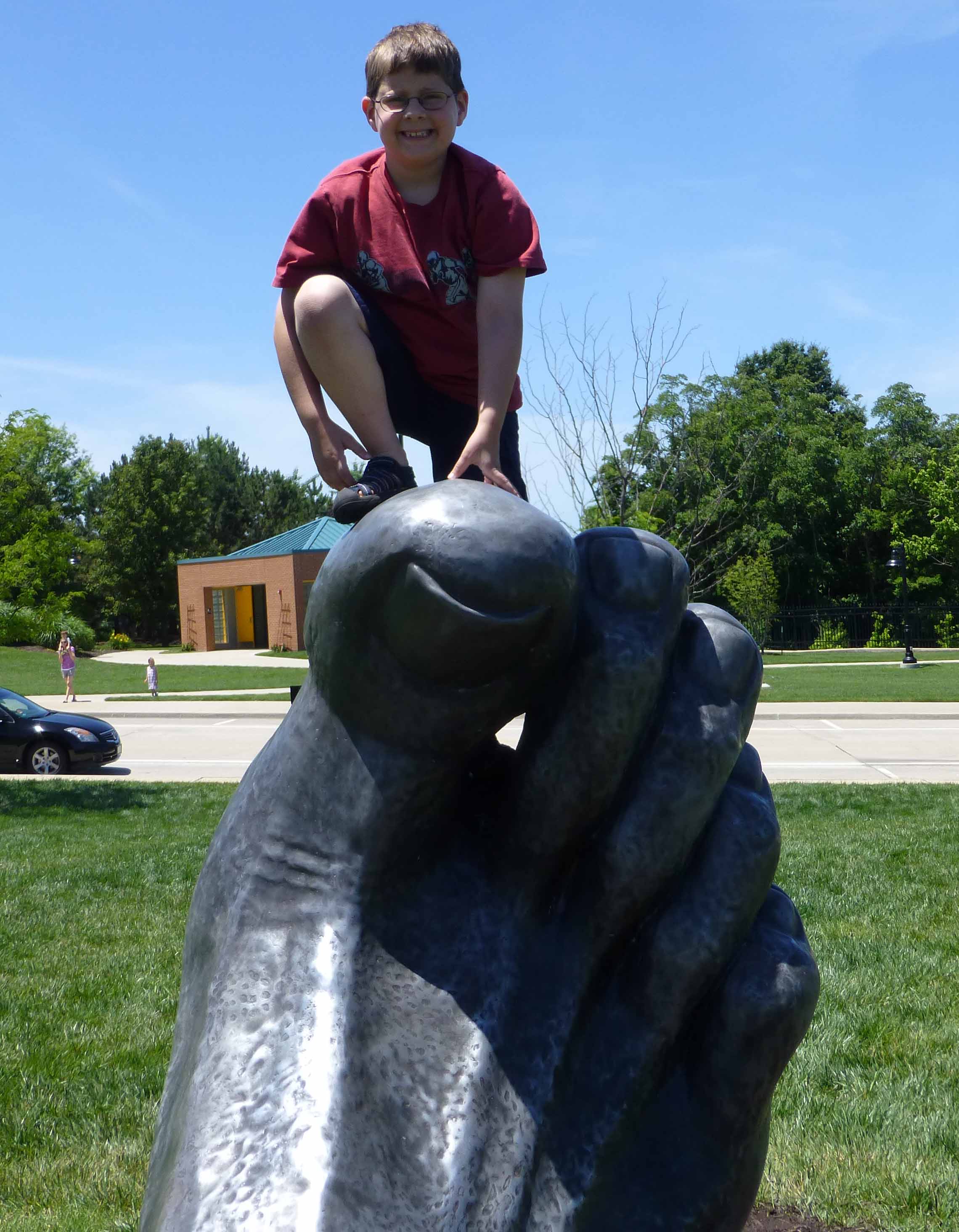 Daddy’s away and so I figured we should play.  The slow start to our morning was wonderful and having children empty the garbage cans throughout the house was a real high for me.  The 75 degree weather was too much to ignore and so we headed out for the afternoon. First a picnic at a “new to us” park.picnicWe laughed and danced a bit and then made eyes at each other.eyesAfter lunch was over we went across the street to check out a gigantic sculpture called “The Awakening”.  Apparently a man is waking up and coming out of the ground.  The kids kept saying it was “freaking them out” so I staged a few photos to make it even more fun. . . I call this one “Wrapped Around His Finger”.wrapped around her fingerAnd this on is called “Right on the Nose”onthe noseAnd then there is, “Shin Sprints”:shin sprintAnd lastly, “Stepping on His Toes”:step on his toesAll this silliness was followed up with an hour on the playgroundplaygroundand then a trip to the librarylily library thomas reading KB readingfollowed by shakes at Sonic. It was fun, fun, fun.