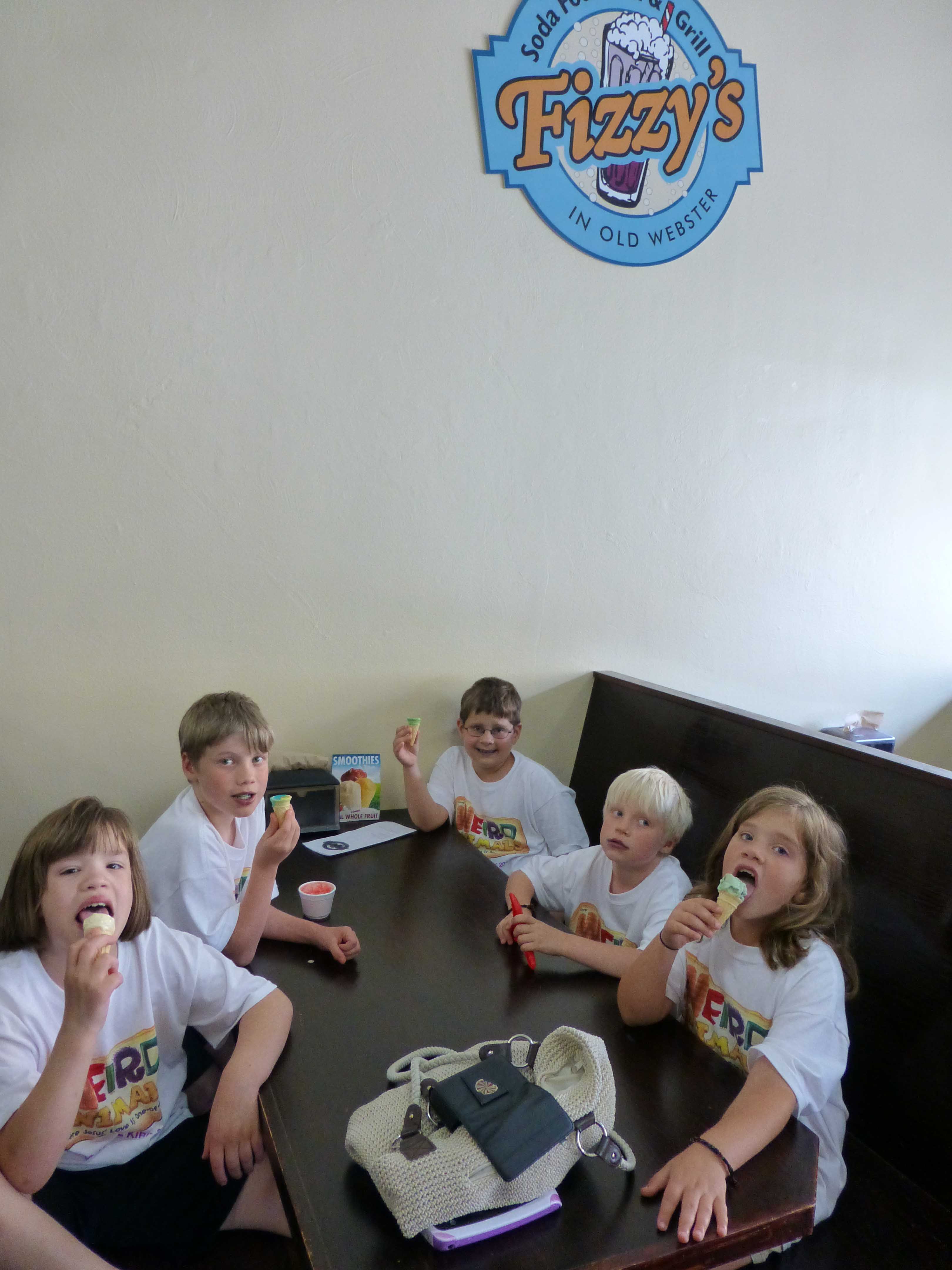 Fizzy’s tweeted that they would give a free ice cream cone to any children coming in wearing their VBS tshirts.  So many things about that are wonderful! FREE!! ICE CREAM! TSHIRTS! So, we piled into the van, set the iPad to direct us, and headed out for our first trip to Fizzy’s.FIzzyIt was so very fun and somewhat depressing.  These little boys are family and our family is moving away.  Everybody felt it though none of them to put words to it. I started to talk about it and Bubba interrupted, “Could we please talk about something else?”