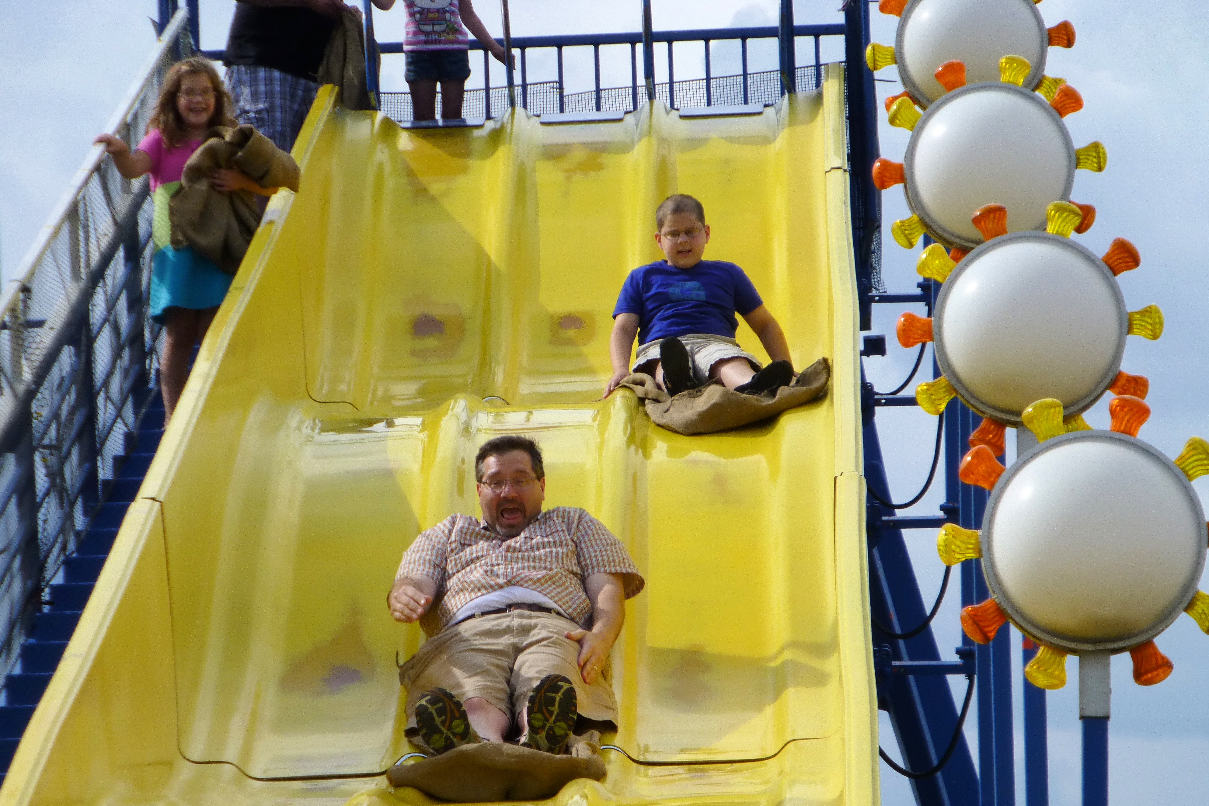 For two weeks I have heard Bubba talk about his birthday and how I said we would go back to the slide. I got on the computer and started looking around.  It turns out there is a place IN TOWN that has a similar slide and lots of other fun things to do.  That place? Fort Fun:P1000512We hit the bumper cars right away and it was  favorite for everyone.  Only four of us could go at a time and that was fine for the kids. . .it meant they got to ride more times so that both mom and dad could have turns.P1000519There was a game of mini-golf:P1000524Arcade games and then the Pièce de résistance, the SLIDE.  Everyone loved the slide!P1000528 P1000529 P1000530
