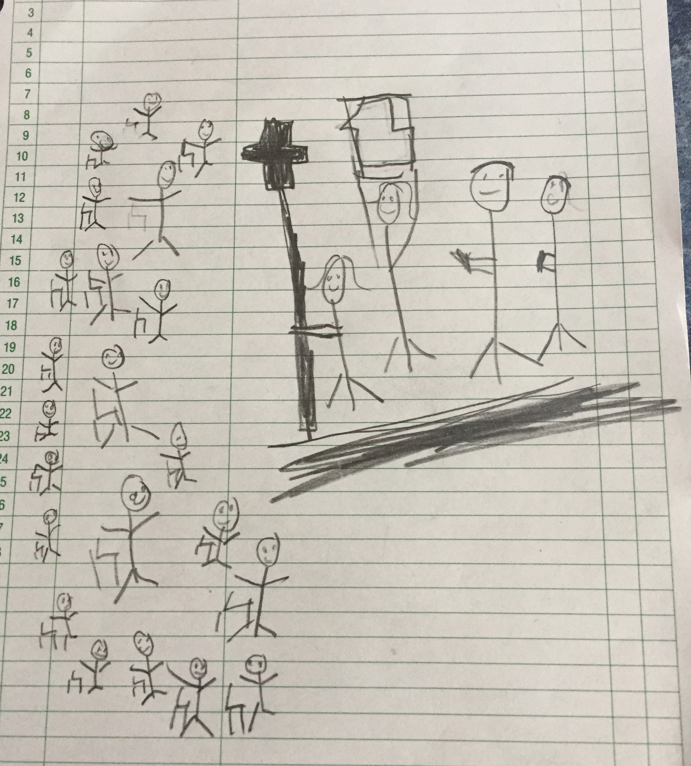 The little church we have been visiting celebrated ten years yesterday and we stayed for the “hot dog bar” lunch. It was a good thing. So funny. . .the choices for lunch were hot dogs or vegan chili. Of course the Kicks ate hot dogs. The church is a reformed Anglican church and it has been a real switch for me. Every week I leave with a new assurance from the Lord that he knows our family and our needs and He has a plan for us that just might include Christ our Hope Anglican Church. (Every time I say it I am a bit thankful that my Daddy is with Jesus. I feel like such a traitor.) KB loves the liturgy and I find that fascinating. She asked me today if I know the Lord’s Prayer by heart and could I teach it to her. Little has already made a name for herself and most folks don’t seem to scared of her. Bubba is wearing his feelings and thoughts close to his sleeve on this one and so I am not sure of his true response. He participates – I can say that much. They keep letting him dip his communion bread into the alcoholic wine chalice (I mean, seriously, doesn’t that sentence sound like something you would NEVER have expected to hear me say?) and maybe that plays into his thoughts on it all. Hmm. We have KB draw pictures during the service . . . I usually say of the sermon but I think her daddy must have used the phrase “draw what’s going on” and she drew this. . .