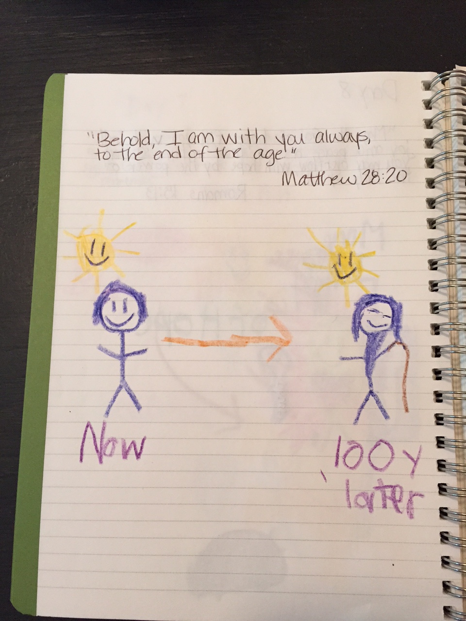 IMG_2455The school where they are all attending starts at 9:00 AM so we had a nice leisurely morning before they had to be there. Honestly, this is one of the things I am most excited about this year. We had breakfast together – it was “National Pancake Day”, so we had pumpkin pancakes. We spent time with God together. It was so great.IMG_2456You can see the verse we looked at. . . this is Bubba’s picture. I wish I had a recording of his voice saying, “This is me now and God is with me and loves me completely (God is represented by the smiling sun in all of Bub’s pictures) and this is me when I am old and God is still with me and loves me just as wholly and completely.” Seriously? Happy mom moment for sure.