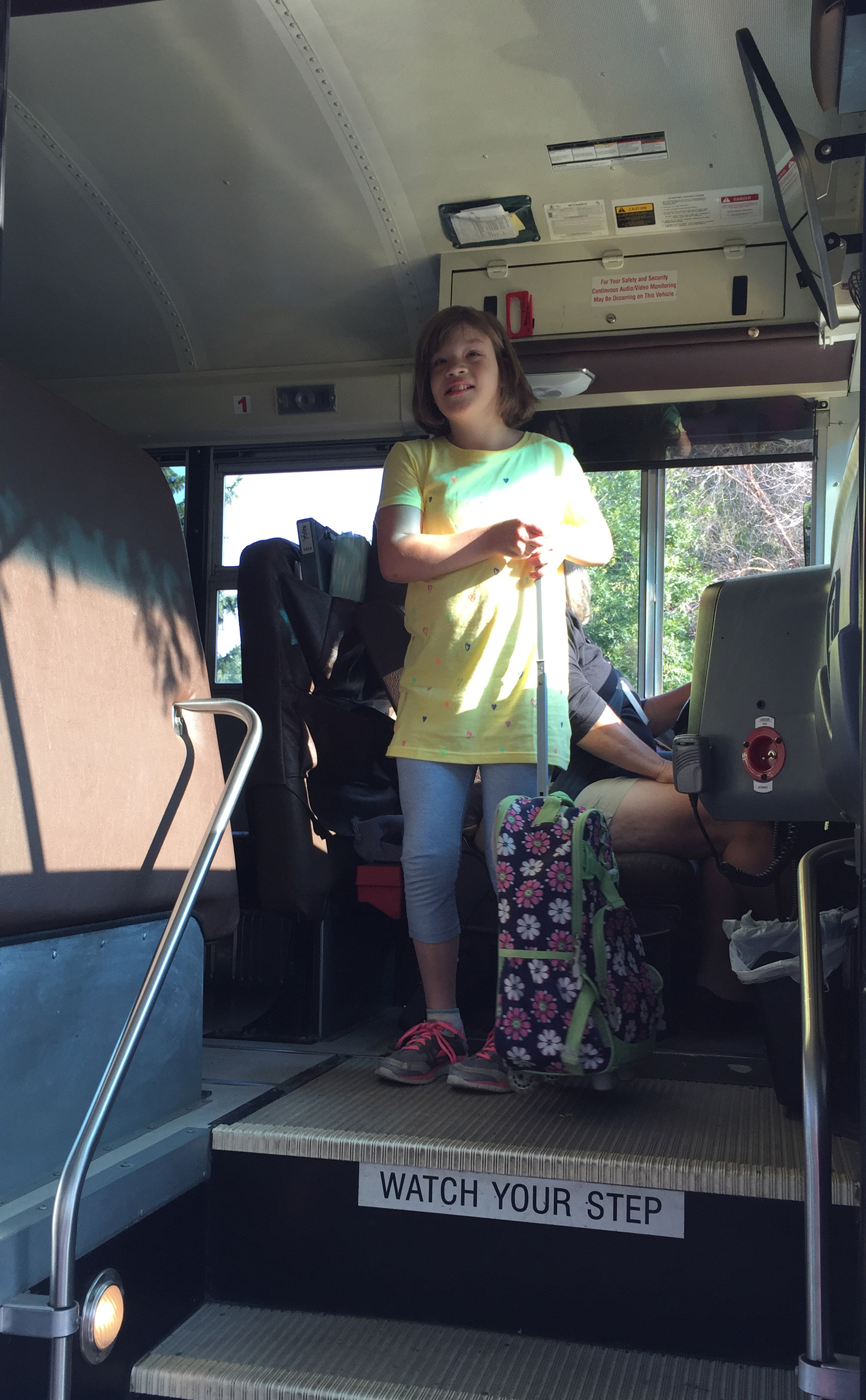 IMG_2482Little was committed to riding the bus even though I was going to have to drive her siblings in the car right behind her (their paperwork is finished yet.) I walked out with her, gave kisses, and waved her off; she has the same bus driver as last year and it was “home-townish” to see and greet someone we knew.